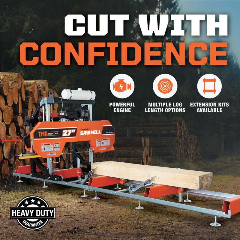 TMG Industrial 27" Portable Sawmill, 14 HP Kohler Gas Engine, 21" Board Width, 12' Log Length, 14-1/2' Track Bed, TMG-PSM27