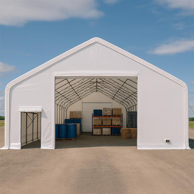 TMG-ST3062V 30x60 peak ceiling storage shelter with heavy duty 17 oz PVC cover, galvanized steel frame, and drive-through roll-up doors for equipment storage