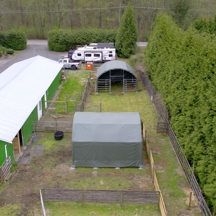 20' x 20' karja-aitaussuoja, pulverimaalattu rakenne, 12' kupumainen katto, 17 oz:n armeijanvihreä PVC-kangasverhoilu, 6-tankoiset aitauspaneelit, 5' etuportti, TMG-ST2020L