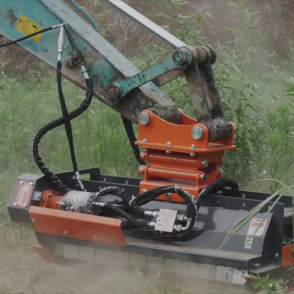 TMG-EFM48 kaivinkoneen risu-leikkuri on kompakti mutta tehokas lisälaite, joka tekee vaikeasti tavoitettavien puiden, pensaiden tai minkä tahansa kasvillisuuden poistamisesta yksinkertaista ja tehokasta.