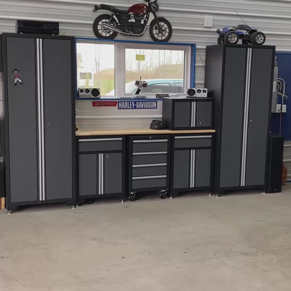 Jokaisen kaapin sisällä on säädettävät hyllyt 7,6 cm:n välein optimoitua säilytystä ja käytännöllisyyttä varten, ja 70-tuumainen työpöytätila sopii erinomaisesti yksityiskohtaisempaan työhön tai kaikkien työkalujen ja osien valmisteluun työtä varten. Tässä säilytysyhdistelmässä on täyspitkät upotetut alumiiniset vetokahvat ja paistettu pulverimaalaus, jotka antavat tyylikkään, raskaaseen käyttöön tarkoitetun ulkonäön, joka on kestävä ja kulutusta kestävä.